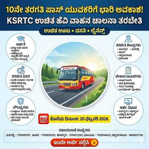 ಉದ್ಯೋಗಕ್ಕಾಗಿ ಹುಡುಕುತ್ತಿರುವ ಯುವಕರಿಗೆ KSRTC ಉಚಿತ ಹೆವಿ ವಾಹನ ತರಬೇತಿ ದೊಡ್ಡ ಅವಕಾಶವಾಗಿದೆ. ಯಾವುದೇ ಶುಲ್ಕವಿಲ್ಲದೆ ಕೌಶಲ್ಯಾಭಿವೃದ್ಧಿ ಮಾಡಿ, ಅಧಿಕೃತ ಚಾಲನಾ ಪರವಾನಗಿ ಪಡೆದು, ಭವಿಷ್ಯವನ್ನು ಭದ್ರಗೊಳಿಸಿಕೊಳ್ಳಬಹುದು ಹಾಗೆ ಅರ್ಹ ಅಭ್ಯರ್ಥಿಗಳು ವಿಳಂಬ ಮಾಡದೆ ತಕ್ಷಣ ಅರ್ಜಿ ಸಲ್ಲಿಸಬೇಕು.ಯಾಕಂದ್ರೆ ಕೊನೆ ದಿನಾಂಕ 20 ಫೆಬ್ರವರಿ 2026.